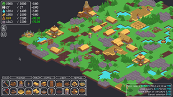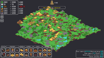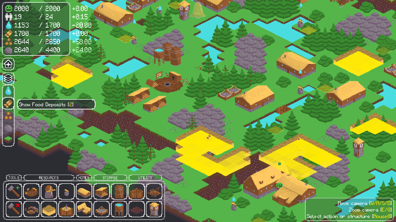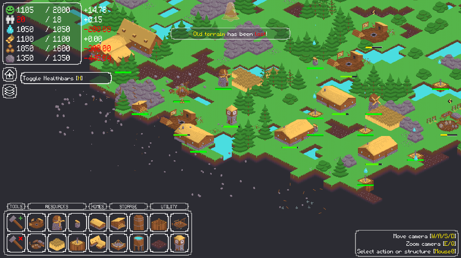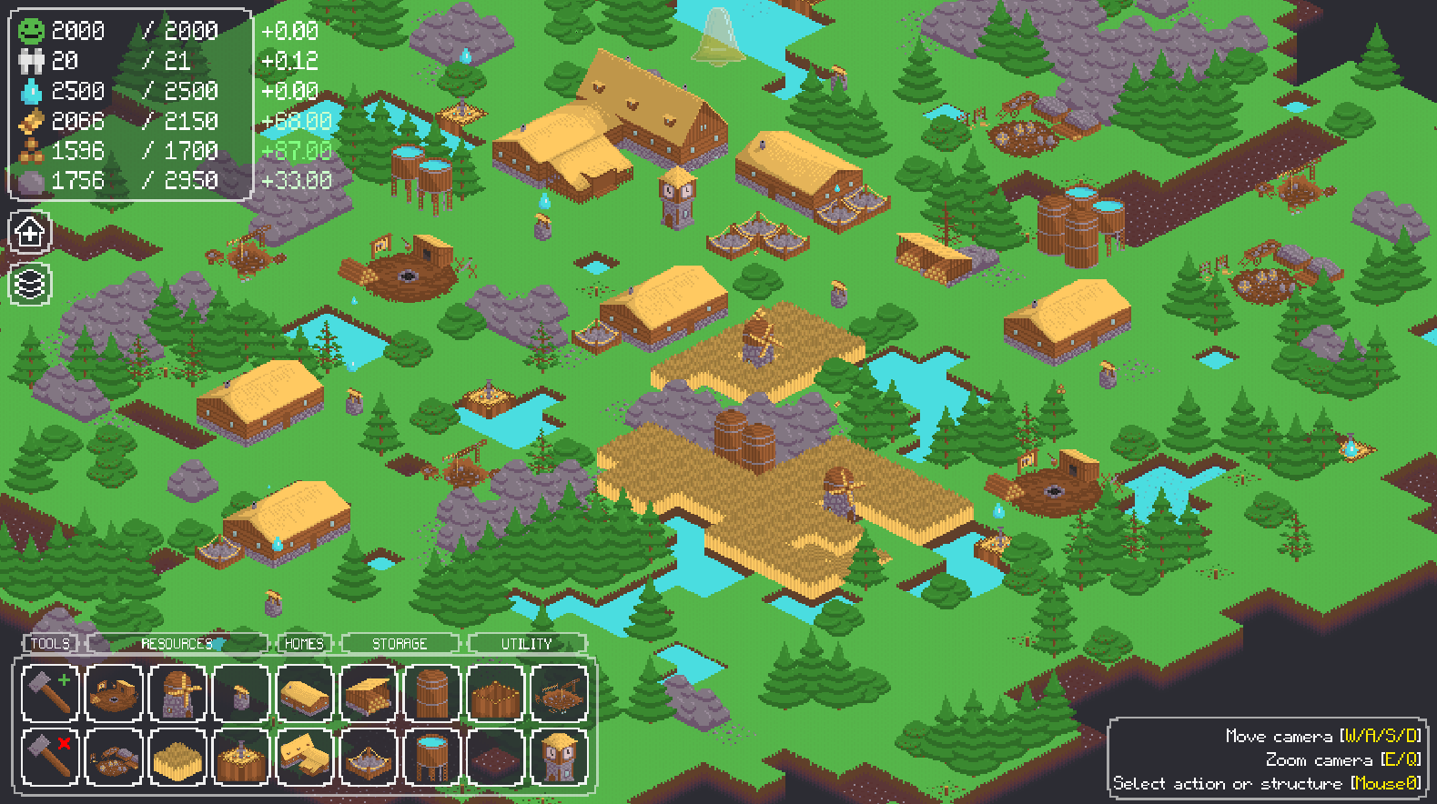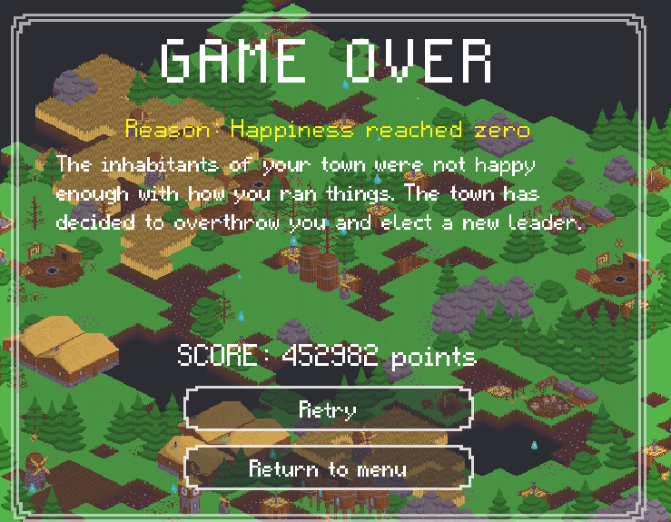 The survival of your town is reliant on three key things: happiness, population, and structures. If any of them reaches zero, it's game over! To keep your population happy and healthy you must gather food and water from the surrounding world. You can do so by building structures, for which you will need wood and stone.
