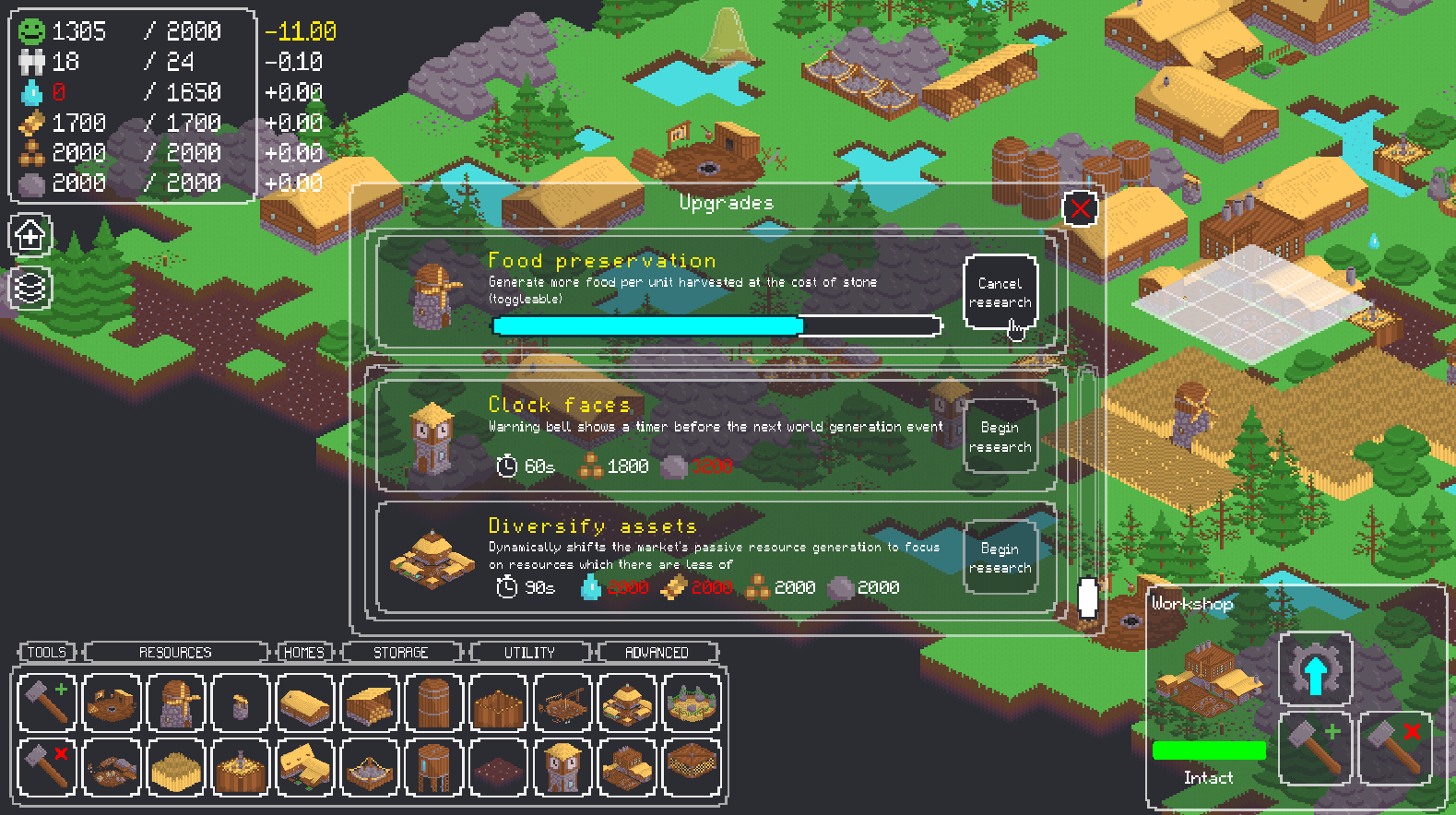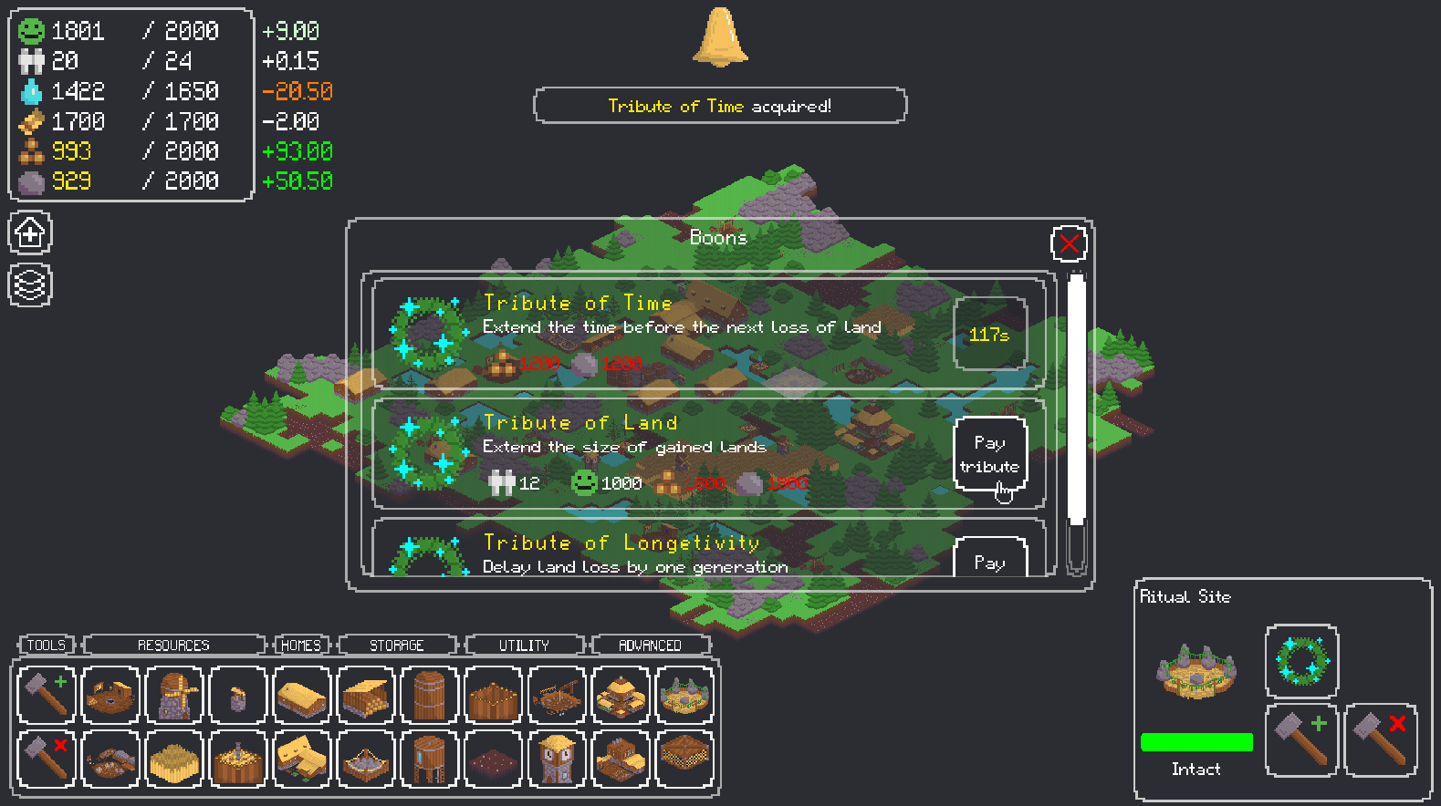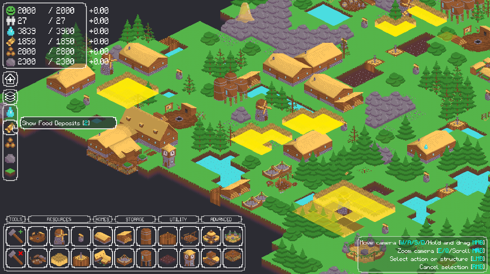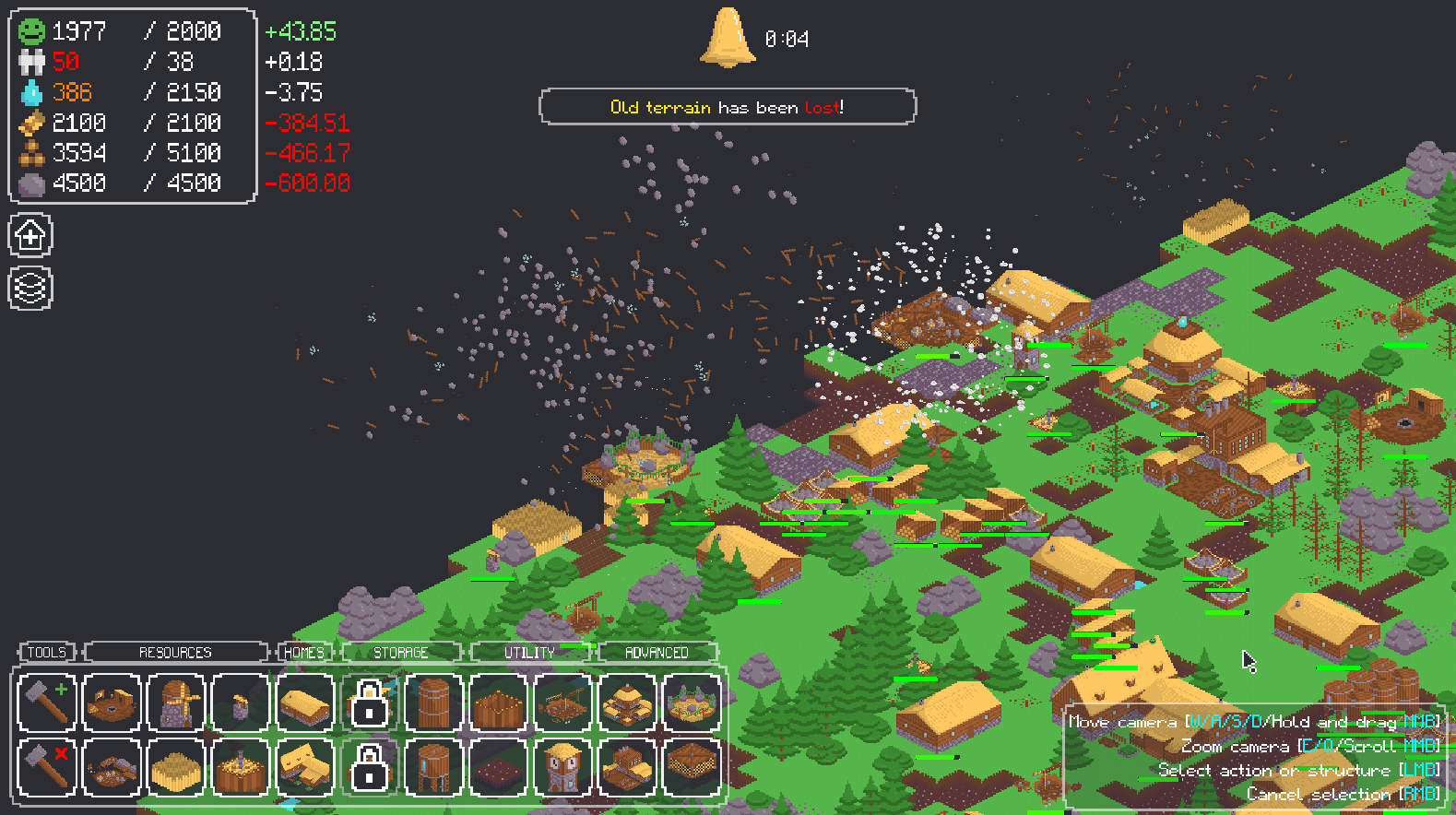 The survival of your town is reliant on three key things: happiness, population, and structures. If any of them reaches zero, it's game over! To keep your population happy and healthy you must gather food and water from the surrounding world. You can do so by building structures, for which you will need wood and stone.