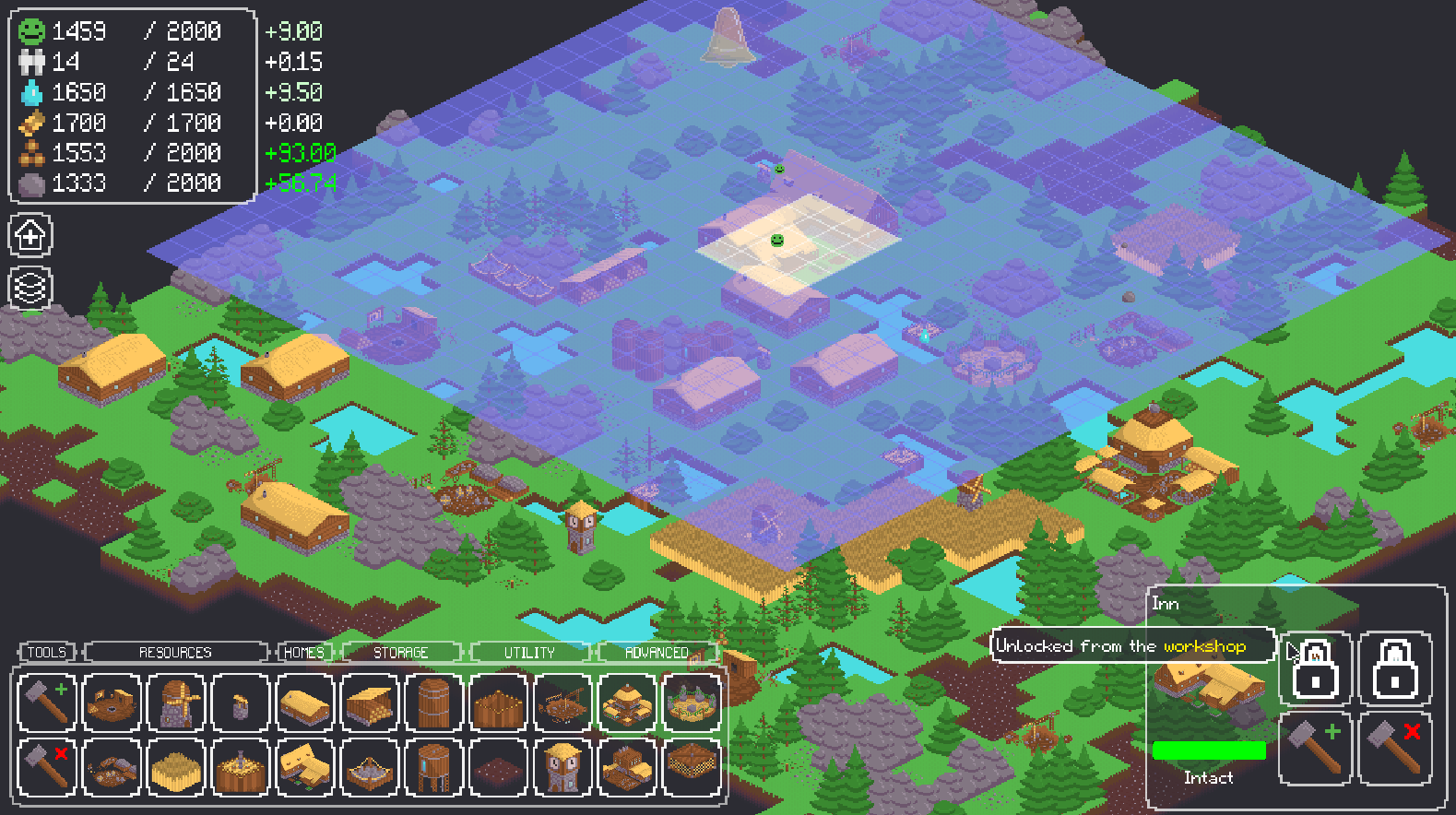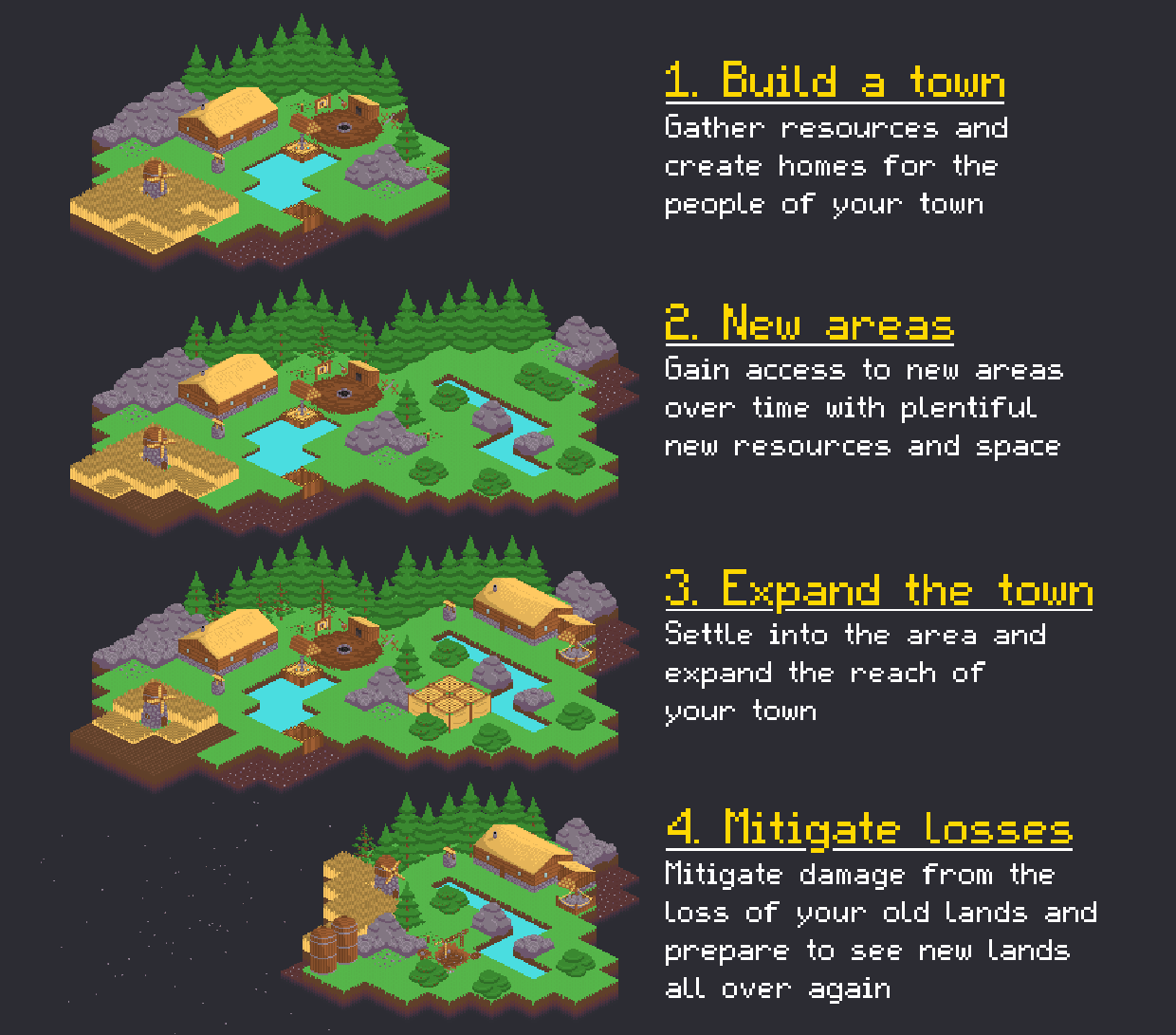 Your town starts out in the middle of an island floating within an endless abyss. As time progresses new areas will appear, granting access to more resources and space to build in. Old areas will disappear some time after new areas have appeared, taking with them any structures that were built on them. In order to survive you must expand your town alongside the moving world before it is too late.